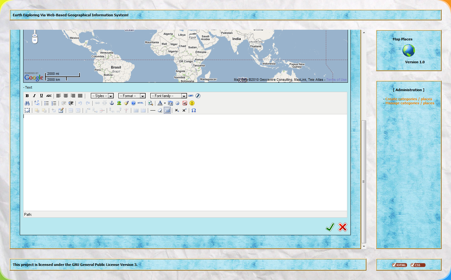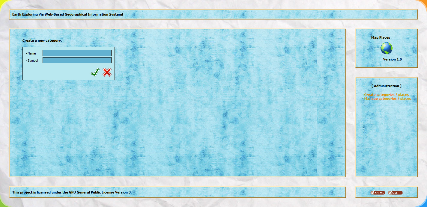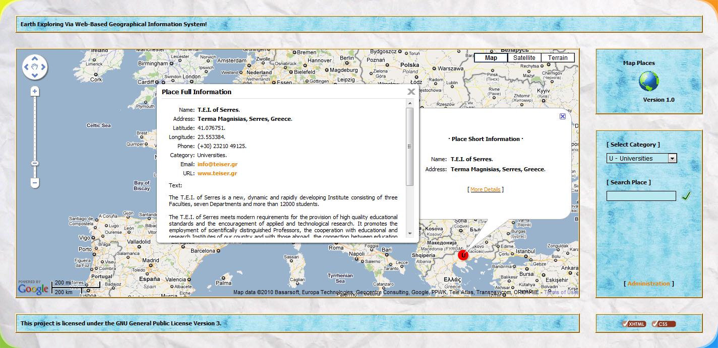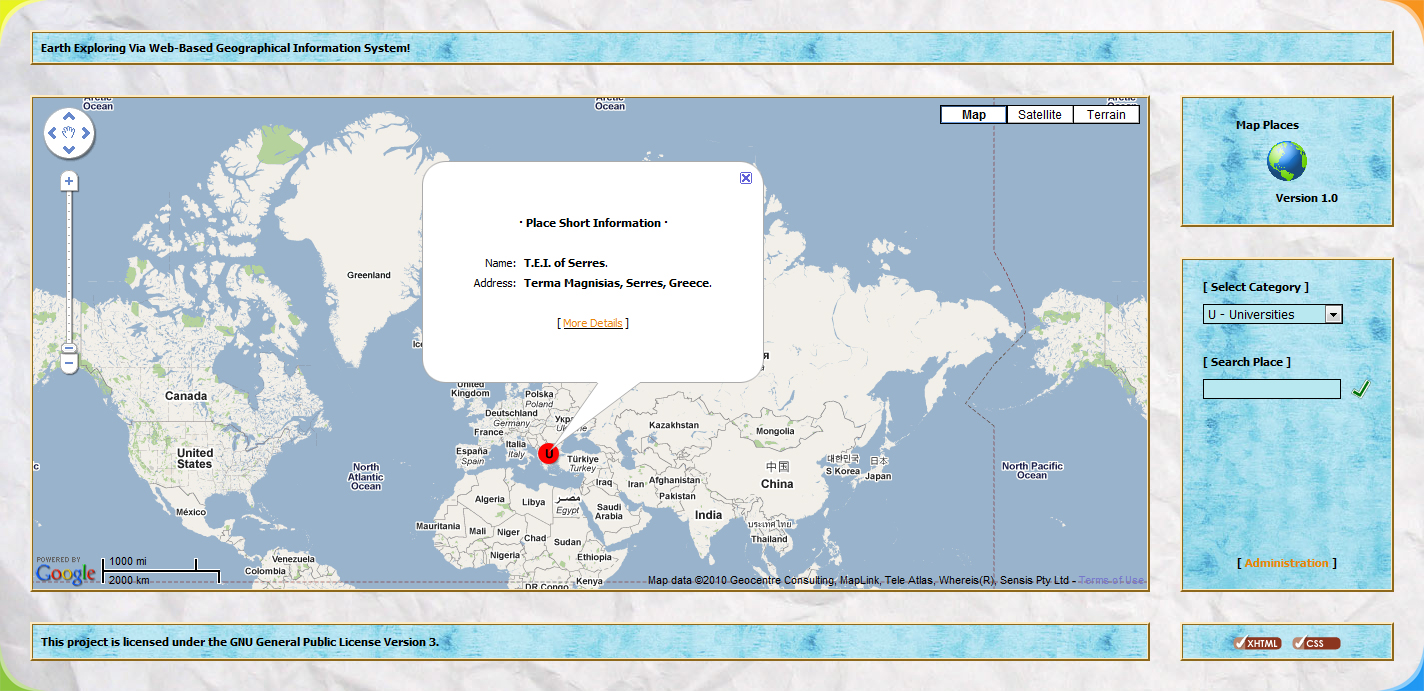 This project refers to a safe, friendly and useful to the end-user Web Geographic Information Management System which is used for displaying and managing GIS on the Internet. The Geographic Information is located on an exclusive database (MySQL) and the user can browse them by categories. The system also has both front-end for the viewing of GIS as well as back-end for managing the overall system.