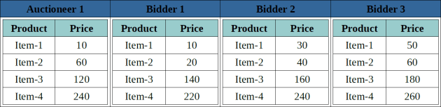 Here is an example showing the auction product items used by the Auctioneer and 3 Bidders: